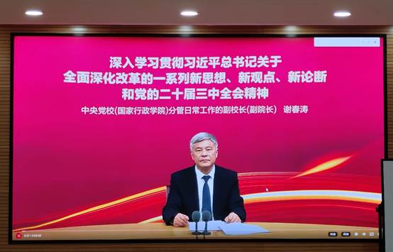 为进一步学习贯彻习近平新时代中国特色社会主义思想和党的二十届三中全会精神,提升支部党员的政治素质和党性修养,2024年11月15日下午,ok138cn太阳集团古天乐本科生二支部在知行楼(经管楼)309教室集中观看学习了中央党校(国家行政学院)副校长(副院长)谢春涛领学的“深入学习贯彻习近平总书记关于全面深化改革的一系列新思想、新观点、新论断和党的二十届三中全会精神”在线课程。