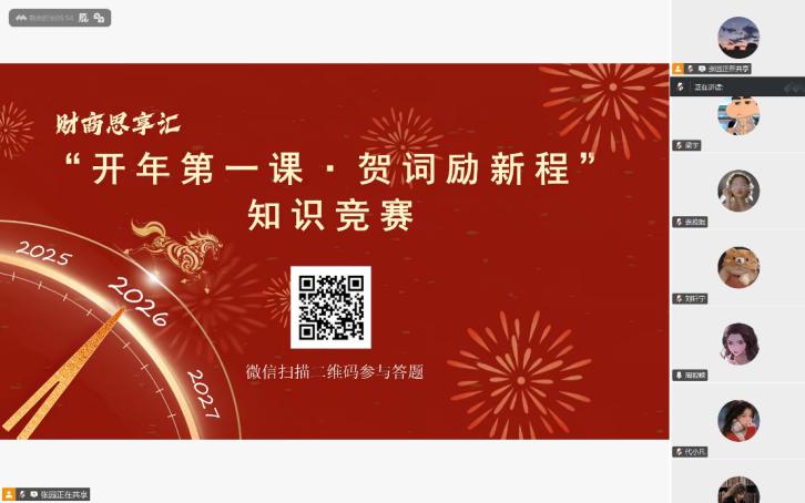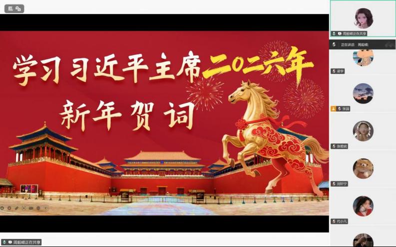 2026年1月16日下午,ok138cn太阳集团古天乐本科生二支部以“开年第一课·贺词励新程”为主题,通过腾讯会议开展线上主题党日,学习习近平主席年二〇二六年新年贺词,引导党员同志深刻感悟时代发展、明晰青年责任担当。支部书记周毅嵘主持并领学,支部全体党员参加了学习。
