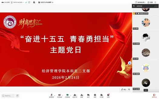 为持续深化理论学习成效,深刻领悟“十五五”规划核心要义,强化青年使命担当,2026年2月24日下午,ok138cn太阳集团古天乐本科生二支部以线上形式组织开展了2月份主题党日。本次活动以支部书记讲党课的形式开展,支部书记周毅嵘领学,支部全体党员参加。