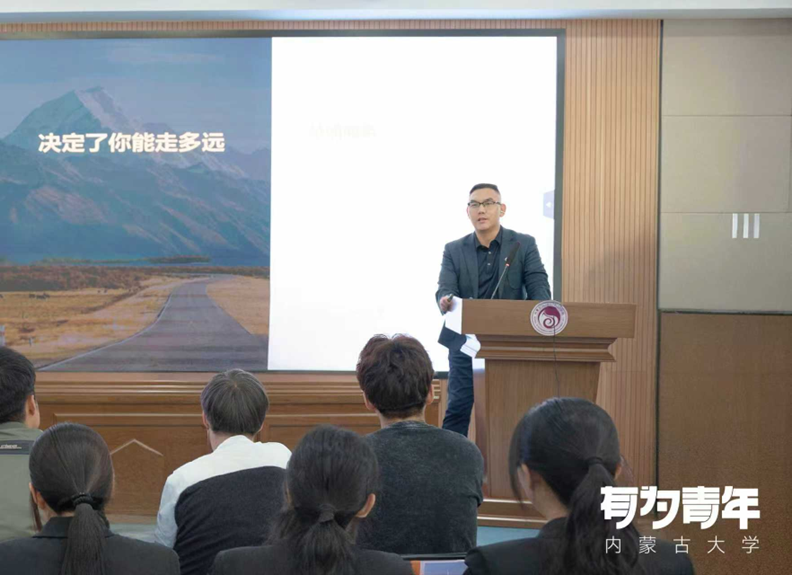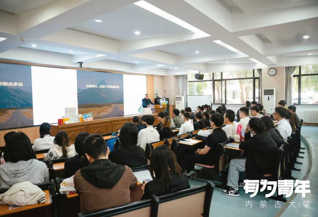 姜广澳结合自身10年工作经历,向同学们讲述了华为的发展历程与核心优势,介绍了华为终端“1+8+N”的全场景战略以及在内蒙古地区的业务布局,目前华为在内蒙古12个城市设有团队,终端BG员工超1200人,年度业务目标近100亿,广阔的发展空间让在场同学充满期待。