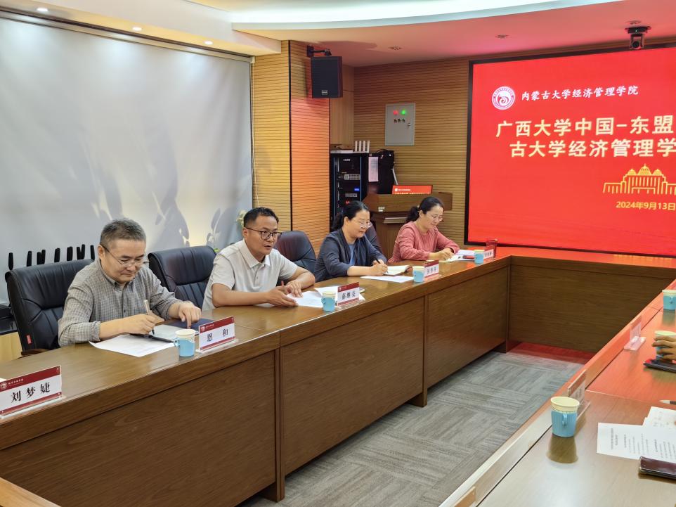 2024年9月13日,广西大学中国-东盟经济学院李光辉院长一行来太阳集团官网交流,在赛罕校区知行楼(经管楼)115会议室举行了研讨会。广西大学中国-东盟经济学院李光辉院长、广西大学来访专家、学院相关专业教师及学科办、行政办相关负责老师参加了会议,会议由学院副院长薛继亮主持。